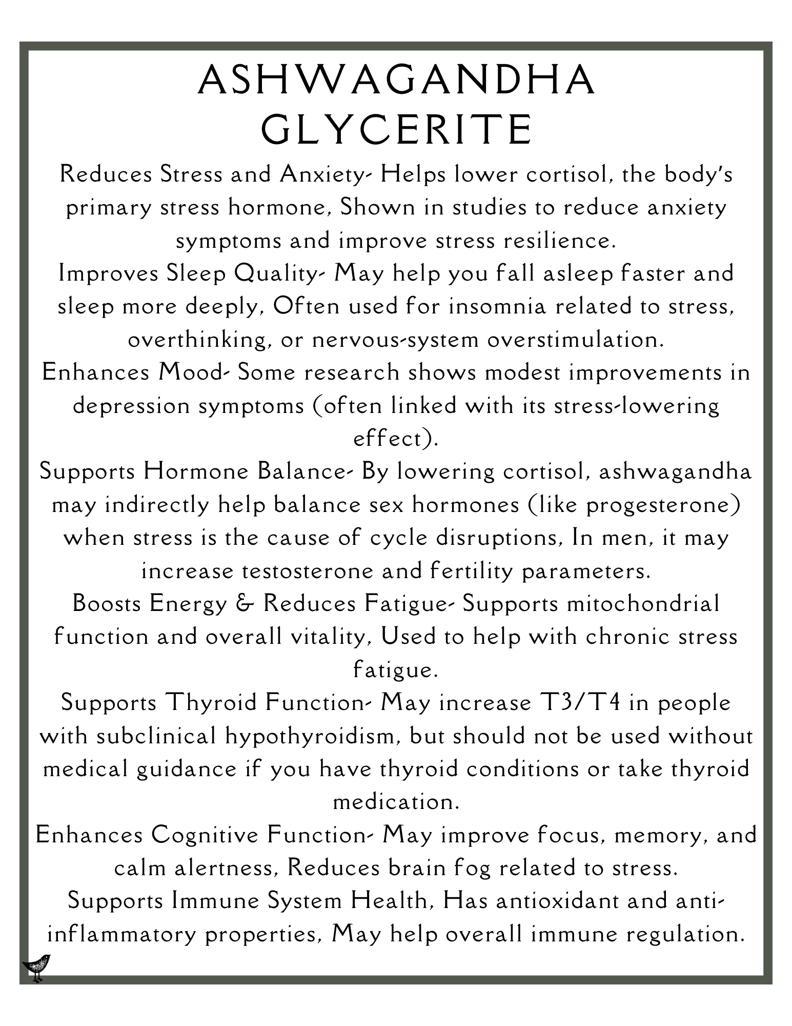 Ingredients: Organic Ashwagandha, Coconut-Derived Vegetable Glycerin Base, Distilled Water