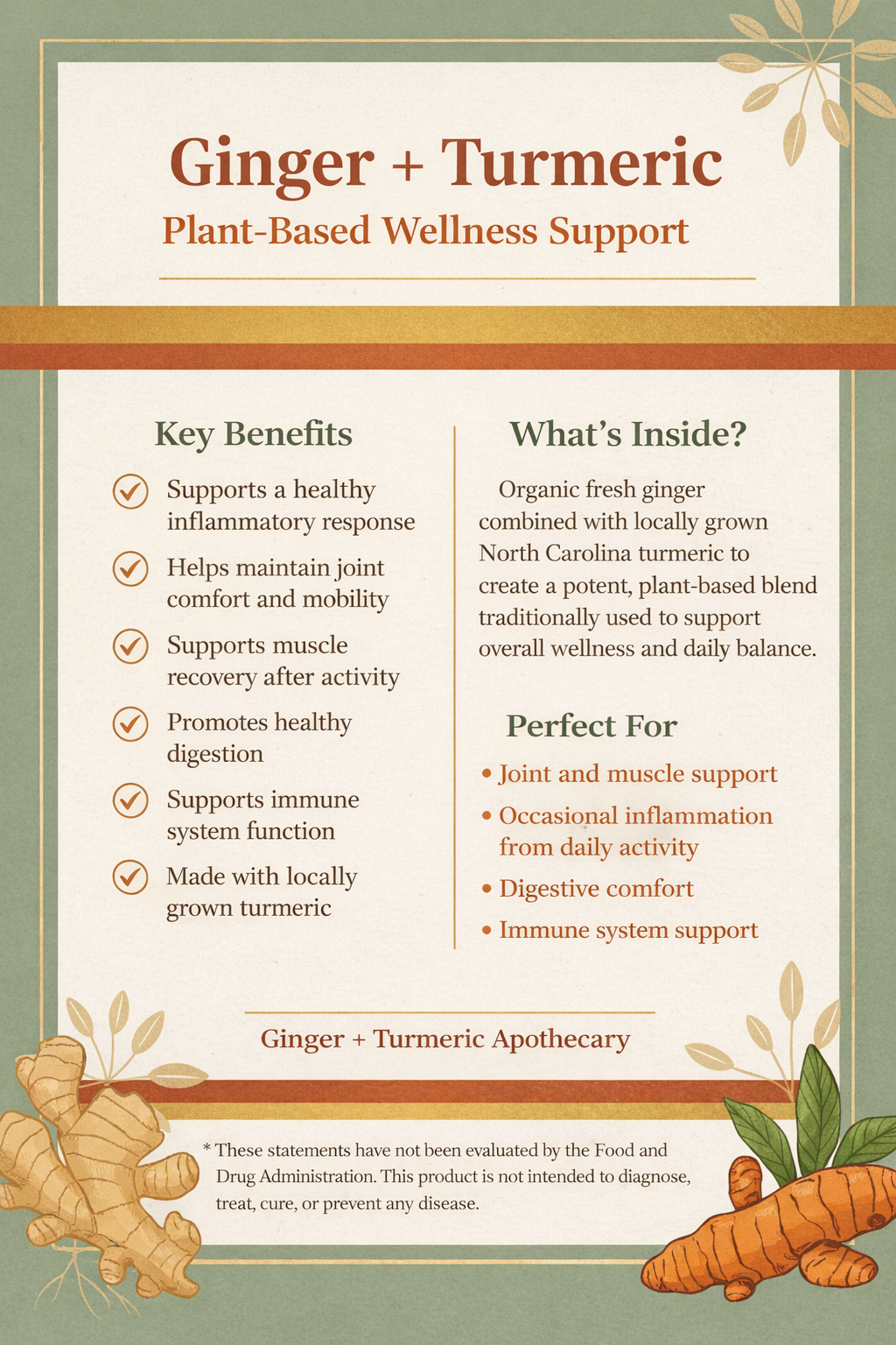 Ginger and turmeric are two of nature's most powerful anti-inflammatory compounds. Ginger contains gingerols that reduce pain and inflammation while supporting digestion. Turmeric contains curcumin, a potent anti-inflammatory that rivals pharmaceutical options without the side effects. Together, they create a synergistic effect for maximum benefit.