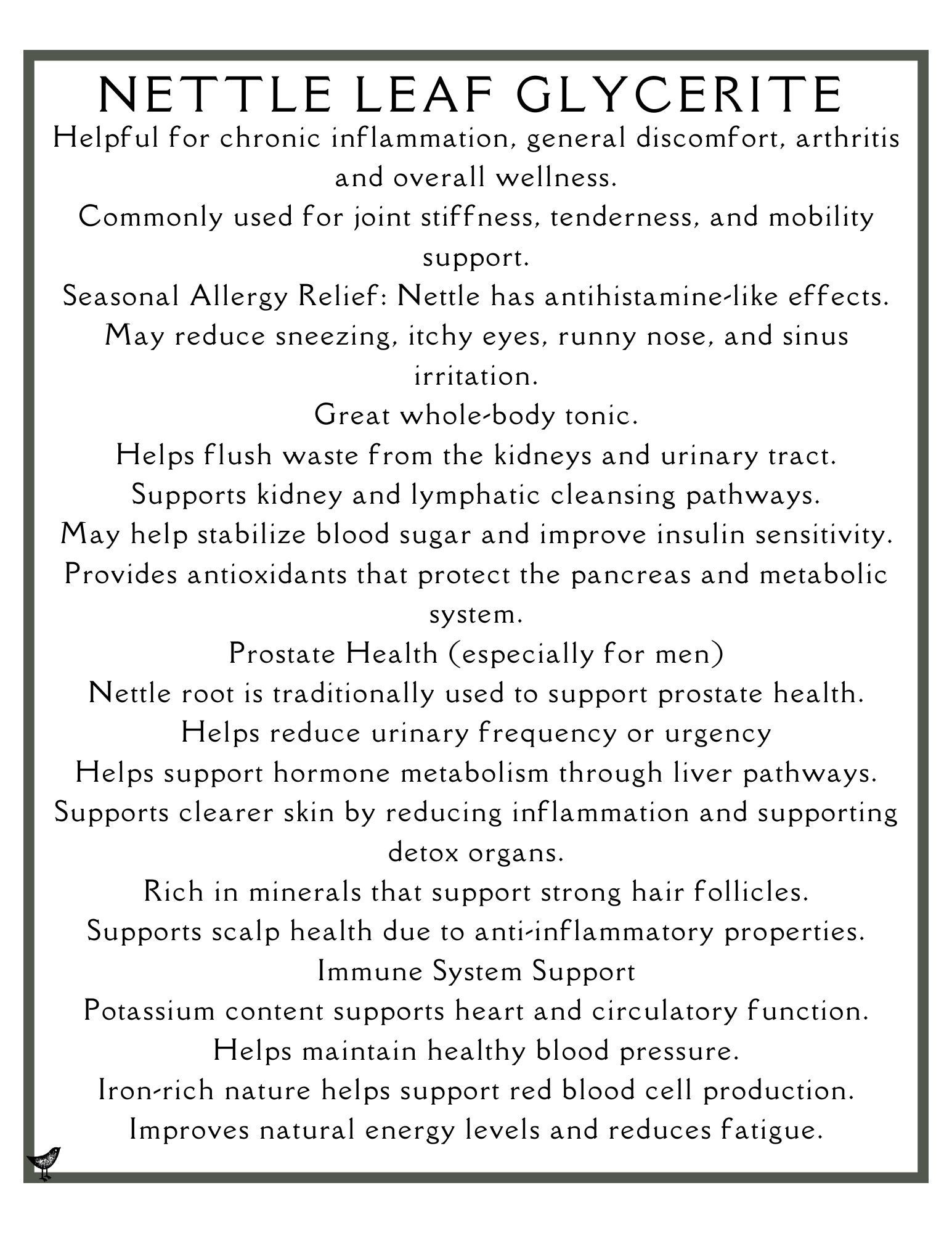 Ingredients: Organic Nettle Leaf, Coconut-Derived Vegetable Glycerin Base, Distilled Water